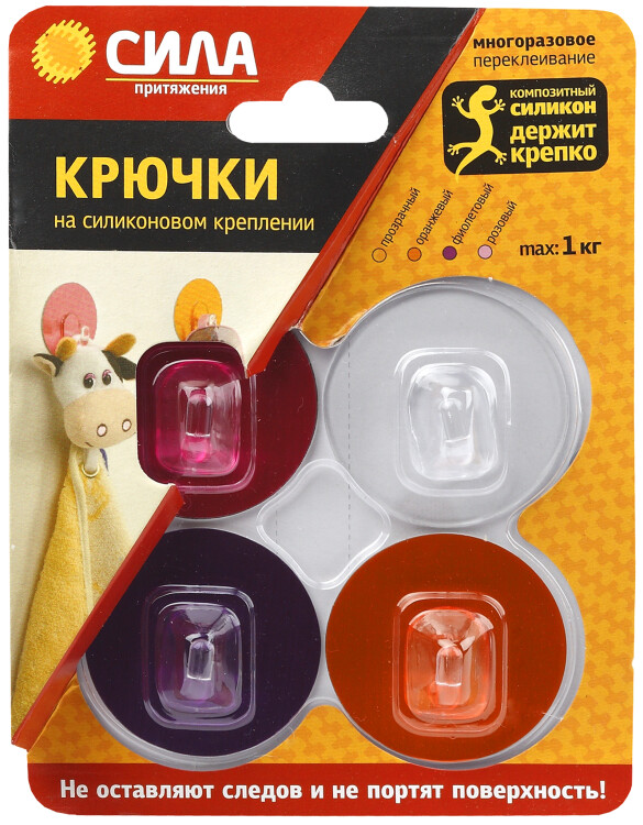 Эффективные крючки на силиконовом креплении СИЛА SH5-R4GMIX-24. Набор из 4 самоклеящихся крючков разных цветов: оранжевый, фиолетовый, розовый, прозрачный. Форма основания - круглая, диаметр - 5 см. Удачный способ избежать сверления стен или мебели. Инновационные крючки на композитной силиконовой основе надежно удерживают предметы весом до 1 кг. Доступно многоразовое переклеивание с сохранением функций. Не портят поверхность и не оставляют следов. Идеальны для кафеля, пластика, стекла, ламинированных поверхностей. Помогут организовать и украсить пространство - быстро и без проблем. С успехом применяются во влажных помещениях - ванные комнаты, туалеты, кухни. Хорошее решение для подсобок, кладовых, гардеробных, прихожих. Разноцветные крючки-держатели нравятся детям и станут помощниками в преображении детской комнаты, приобщении ребенка к порядку. Хороший вариант для ярких интерьеров или в качестве цветовых акцентов в интерьере сдержанных оттенков.