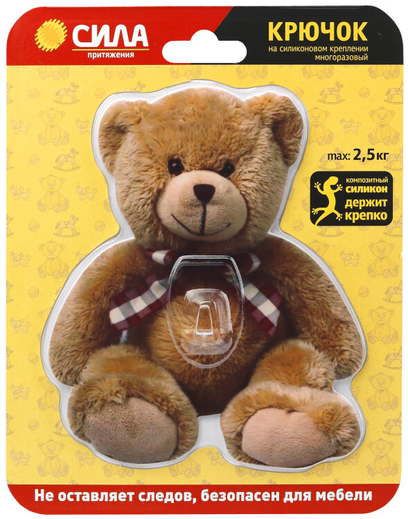 Эффективный крючок на силиконовом креплении СИЛА SHT12-S1C-12 в виде плюшевого мишки. Удачный способ избежать гвоздей, сверления стен или мебели. Инновационный крючок на композитной силиконовой основе надежно удерживает предметы весом до 2,5 кг. Доступно многоразовое переклеивание с сохранением функций. Самоклеящийся крючок не портит поверхность и не оставляет следов. Идеален для кафеля, пластика, стекла, ламинированных поверхностей. Лучшее решение для детской комнаты. Поможет организовать и украсить пространство - быстро и без проблем. С успехом применяются во влажных помещениях - ванные комнаты, туалеты, кухни. Хороший вариант для детского полотенца, детской одежды, аксессуаров, игрушек. Крючки-держатели СИЛА Мишка Teddy нравятся детям и станут помощниками в преображении детской комнаты, приобщении ребенка к порядку. Размер основы: 15 х 12,5 см. Крючок на силиконовой самоклеящейся основе изготовлен прочного поликарбоната.