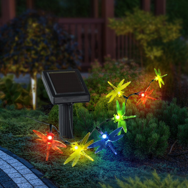 Садовая гирлянда из 20 полупрозрачных стрекоз, длина 5,5 метра. Разноцветные светодиоды: красный, желтый, синий, зелёный.