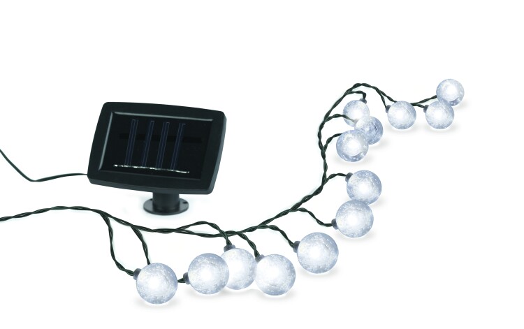 Подсветка реагирует на недостаток света сама и загорается с наступлением сумерек. Яркие фигурки-лампочки шаров, похожие на драгоценные камни, светят холодным светом, создавая неповторимую атмосферу. Такая гирлянда станет прекрасным дополнением к пикнику на природе или вечеринке на веранде.