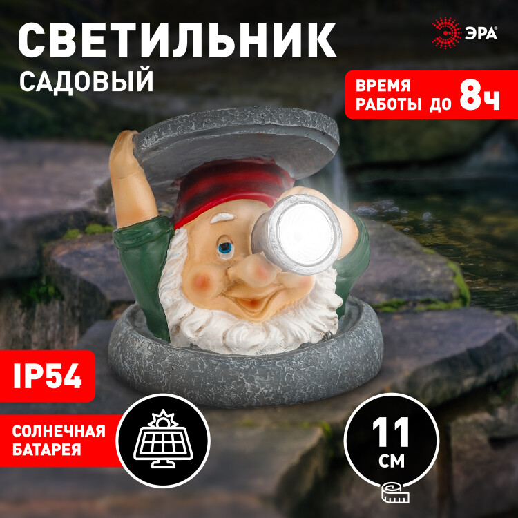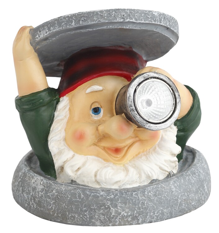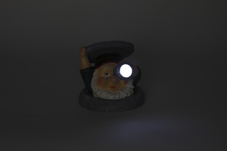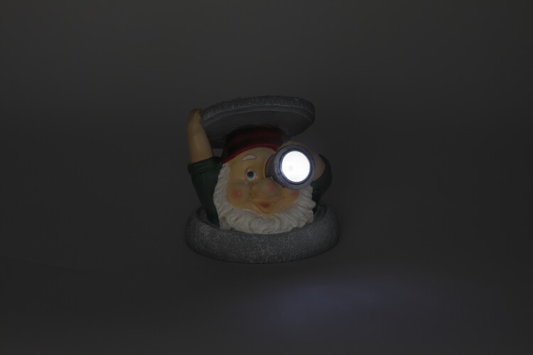 "Керамический" светильник из серии "фигур" - Гном с подзорной трубой. В дневное время суток служит прекрасным украше нием, оживляет пейзаж. Ночью - декоративной подсветкой кустарника, газона, альпийской горки. Использование рефлектора в конструкции обеспе