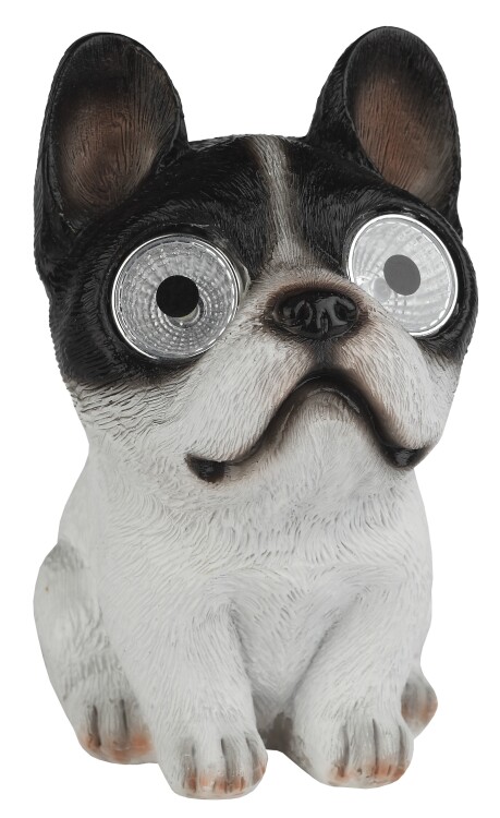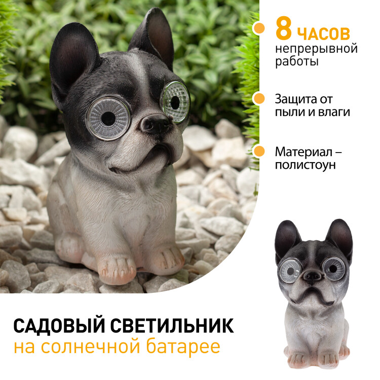 Подсветка реагирует на недостаток света сама и загорается после захода солнца. Маленький бульдог просыпается, освещая территорию вокруг себя ярким белым светом, исходящим из глаз. Собачка выглядит причудливо, однако в то же время изящно подсвечивает пространство вокруг.