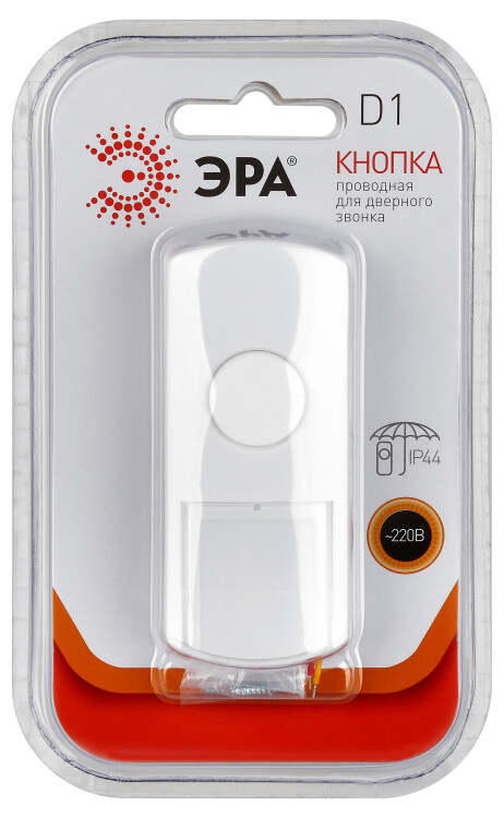 ЭРА D1 - кнопка для дверного проводного звонка. Степень влагозащиты IP44 - корпус из крепкого пластика надежно защищен от влаги и пыли, что позволяет устанавливать кнопку на улице. Стильный универсальный вариант, базовый белый цвет. Лаконичный корпус в стиле минимализм: ничего лишнего. Кнопка просто и удобно монтируется.