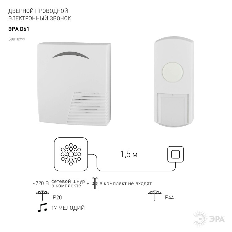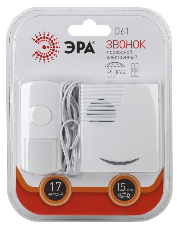 ЭРА D61 (арт. Б0018999) - дверной проводной электронный звонок с 17 мелодиями. Надёжный вариант с сетевым шнуром 1,5 метра в комплекте. Кнопка защищена от влаги и пыли. Аккуратное оформление и базовый белый цвет делают этот звонок универсальным для любого интерьера.