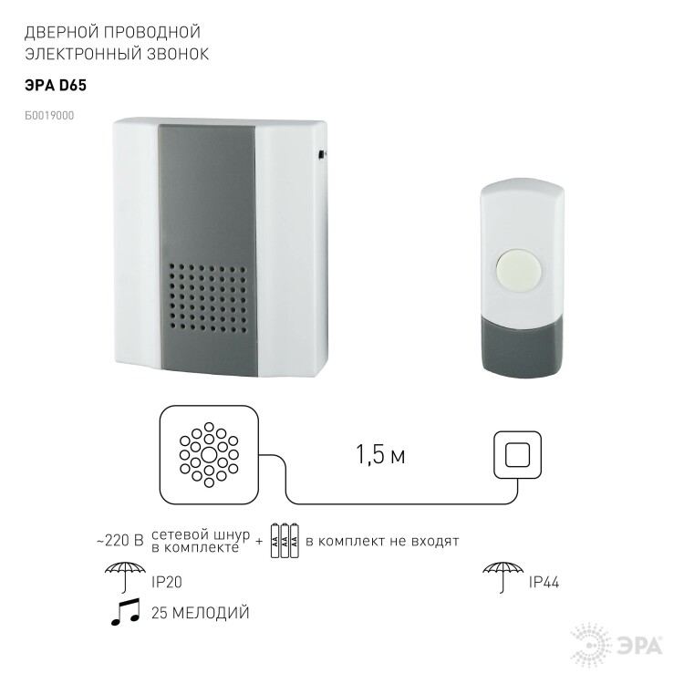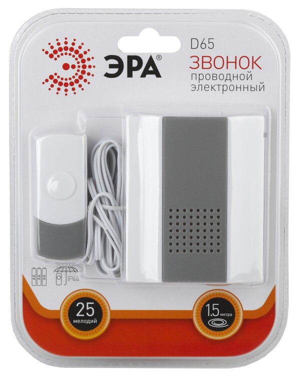 Звонок дверной ЭРА D65 проводной белый с серым 25 мелодий (кр. 1шт)