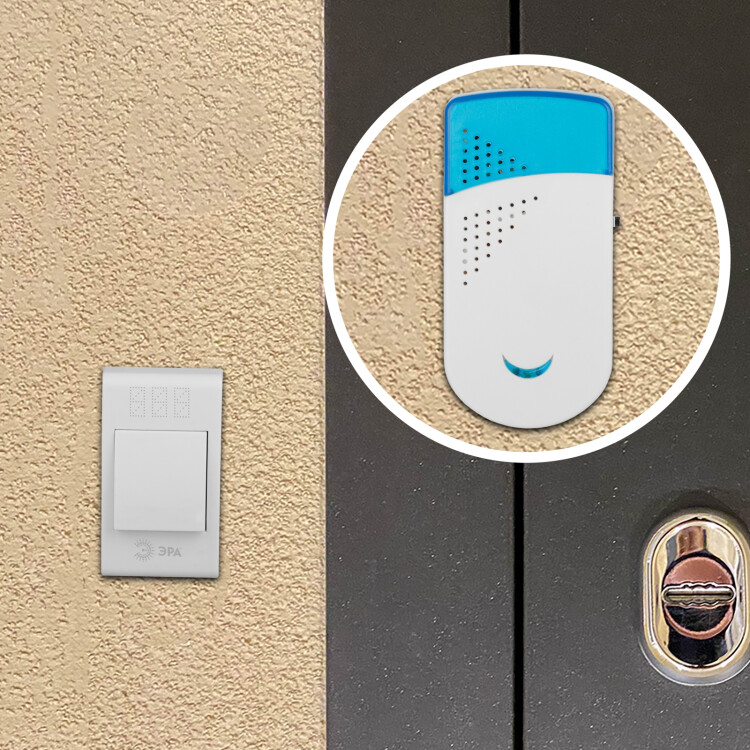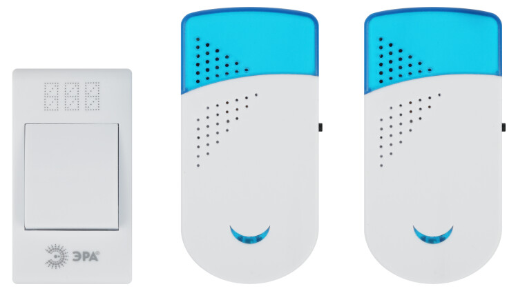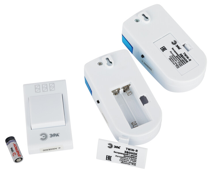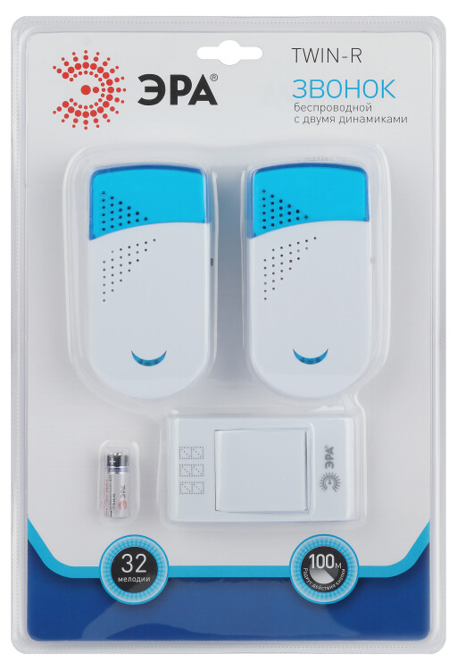 TWIN-R ЭРА - дверной беспроводной электрон ный звонок с двумя динамиками, которые можно установить в разных комнатах. Идеальное решение для больших квартир, частных домов. Радиус действия 100 метров. 32 мелодии вы можете чередовать в зависимости от настроения. Звук такого звонка никогда не надоест. Работает от батареек: 1 шт А23 для кнопки (входят в комплект), по 2 шт ААА мизинчиковые для каждого динамика (в комплект не входят). Аккуратный лаконичный дизайн. Над кнопкой предусмотрено пространство для указания номера квартиры.