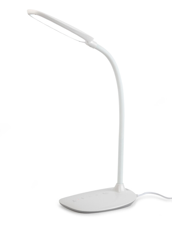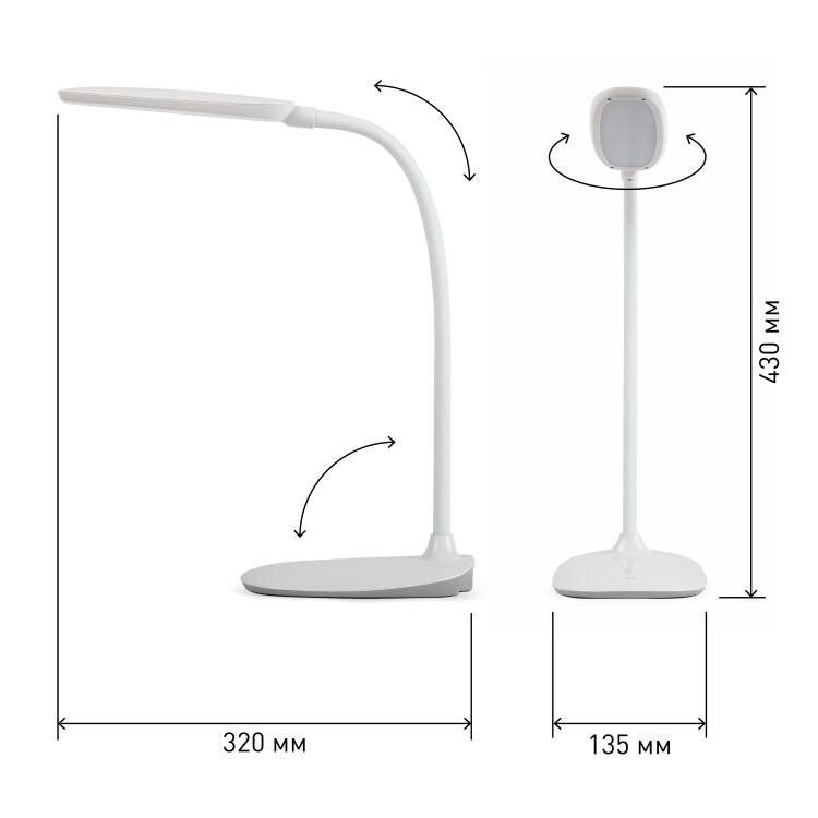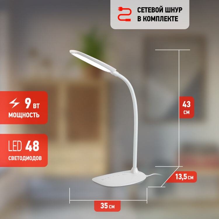 Настольный светильник ЭРА NLED-453-9W-W со светодиодами (LED) в качестве источников света. Оснащен сенсорным управлением, возможностью выбора цветовой температуры (теплый, нейтральный или холодный свет). Есть регулировка яркости освещения, 5 уровней. Удобный выбор направления света - наклон и поворот плафона в любом направлении. Актуальный и в то же время лаконичный дизайн, устойчивое осн ование обтекаемой формы.