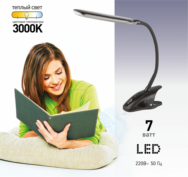 Светильник со светодиодами (LED) в качестве источников света. Удобная прочная прищепка. Направление света регулируется поворотом плафона в любом направлении. Теплый свет, аналогичный свету лампы накаливания - цветовая температура 3000К.