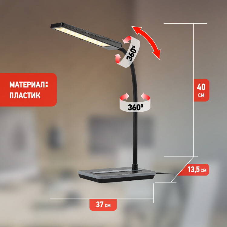 Настольный светильник ЭРА NLED-446-9W-BK со светодиодами (LED) в качестве источников света. Оснащен сенсорным управлением c возможностью регулировки яркости освещения, 4 уровня. Есть регулировка яркости освещения, 4 уровня. Гибкая стойка позволяет настраивать комфортную высоту плафона и направлять свет под любым углом. Современный актуальный дизайн в стиле хай-тек с серыми вставками.