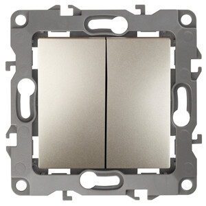 Выключатель 2-клавишный серии Эра 12 скрытой установки механизм цвет шампань 12-1104-04. Номинальные характеристики 10А 250В . Сделан из поликарбоната, оснащёно автоматическими клеммами для быстрй и надёжной фиксации жил кабеля в механиме. Парные клеммы обеспечивают соединение шлейфом. Монтаж в подрозетник производится и на лапки, и на винты. Рамки приобретаются отдельно. Рамки Эра 12: 1 пост 12-5001-хх, 2 поста 12-5002-хх, 3 поста 12-5003-хх, 4 поста 12-5004-хх, 5 постов 12-5005-хх. Рамки Эра 12 Сатин: 1 пост 12-5101-хх, 2 поста 12-5102-хх, 3 поста 12-5103-хх, 4 поста 12-5104-хх, 5 постов - 12-5105-хх (хх - код цвета: 01-белый, 02-слоновая кость, 03-алюминий, 04-шампань, 05-антрацит, 06-чёрный, 07-ольха(белёный дуб-сатин), 08-вишня, 09-дуб, 10-венге, 11-сосна, 21-жёлтый, 22-оранжевый, 23-красный, 24-охра, 25-бордо, 26-лайм, 27-зелёный, 28-голубой, 29-синий).