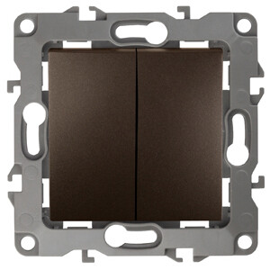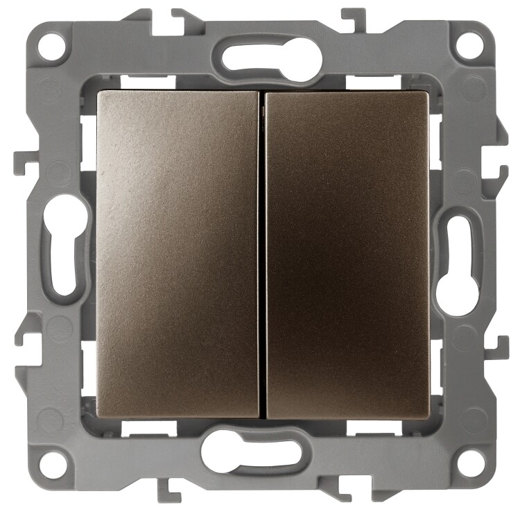 Выключатель 2-клавишный серии Эра 12 скрытой установки механизм цвет бронза 12-1104-13. Номинальные характеристики 10А 250В . Сделан из поликарбоната, оснащёно автоматическими клеммами для быстрй и надёжной фиксации жил кабеля в механиме. Парные клеммы обеспечивают соединение шлейфом. Монтаж в подрозетник производится и на лапки, и на винты. Рамки приобретаются отдельно. Рамки Эра 12: 1 пост 12-5001-хх, 2 поста 12-5002-хх, 3 поста 12-5003-хх, 4 поста 12-5004-хх, 5 постов 12-5005-хх. Рамки Эра 12 Сатин: 1 пост 12-5101-хх, 2 поста 12-5102-хх, 3 поста 12-5103-хх, 4 поста 12-5104-хх, 5 постов - 12-5105-хх (хх - код цвета: 01-белый, 02-слоновая кость, 03-алюминий, 04-шампань, 05-антрацит, 06-чёрный, 07-ольха(белёный дуб-сатин), 08-вишня, 09-дуб, 10-венге, 11-сосна, 21-жёлтый, 22-оранжевый, 23-красный, 24-охра, 25-бордо, 26-лайм, 27-зелёный, 28-голубой, 29-синий).