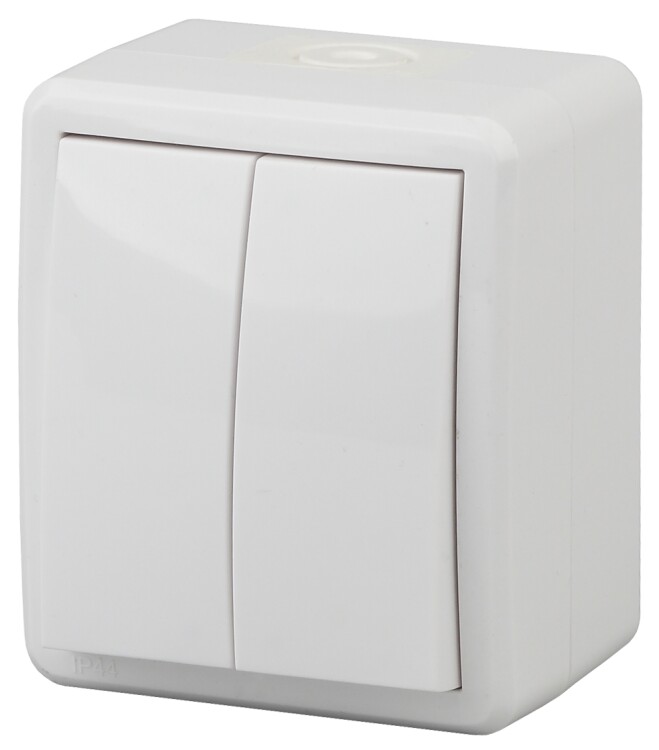 Выключатель влагозащищённый IP54 2-клавишный серии Эра Эксперт открытой уст. цвет белый 11-1404-01. Номинальные характеристики. Выключатель выполнен из качественного поликарбоната, оснащён уникальными винтовыми клеммами ЭКСПЕРТ для максимально качественного зажима кабеля в механизме.