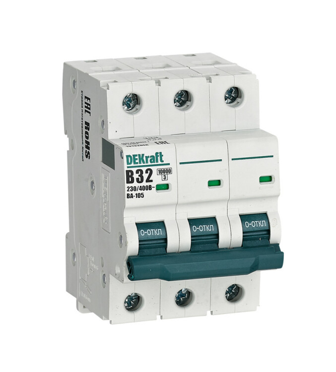 Автоматический выключатель серии ВА-105 DEKraft; 3P; ном. ток 32 А; характеристика В; откл. способность 10 кА; ширина модуля 18мм. Аппараты имеют механизм мгновенной коммутации, 6 монолитных заклепок, которые повышают прочность корпуса. Боковые каналы охлаждения повышают стабильность работы при высоких температурах окружающей среды. Есть возможность установки дополнительных аксессуаров с левой стороны устройства. Аппарат на 100% совместим с корпусами и оболочками DEKraft и Systeme Electric.
