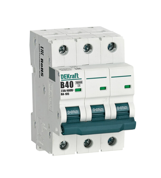 Автоматический выключатель серии ВА-105 DEKraft; 3P; ном. ток 40 А; характеристика В; откл. способность 10 кА; ширина модуля 18мм. Аппараты имеют механизм мгновенной коммутации, 6 монолитных заклепок, которые повышают прочность корпуса. Боковые каналы охлаждения повышают стабильность работы при высоких температурах окружающей среды. Есть возможность установки дополнительных аксессуаров с левой стороны устройства. Аппарат на 100% совместим с корпусами и оболочками DEKraft и Systeme Electric.