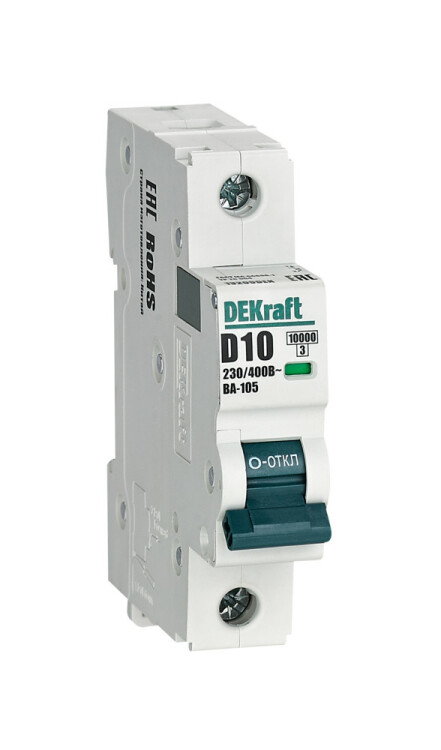 Автоматический выключатель серии ВА-105 DEKraft; 1P; ном. ток 10 А; характеристика D; откл. способность 10 кА; ширина модуля 18 мм. Аппараты имеют механизм мгновенной коммутации, 6 монолитных заклепок, которые повышают прочность корпуса. Боковые каналы охлаждения повышают стабильность работы при высоких температурах окружающей среды. Есть возможность установки дополнительных аксессуаров с левой стороны устройства. Аппарат на 100% совместим с корпусами и оболочками DEKraft и Systeme Electric.