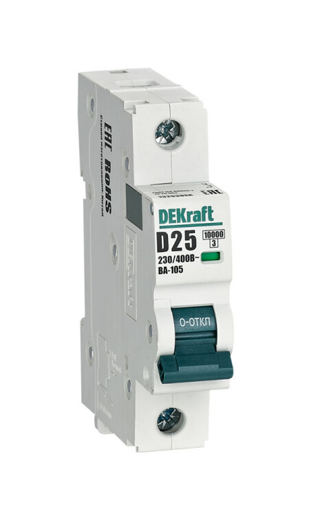 Автоматический выключатель серии ВА-105 DEKraft; 1P; ном. ток 25 А; характеристика D; откл. способность 10 кА; ширина модуля 18 мм. Аппараты имеют механизм мгновенной коммутации, 6 монолитных заклепок, которые повышают прочность корпуса. Боковые каналы охлаждения повышают стабильность работы при высоких температурах окружающей среды. Есть возможность установки дополнительных аксессуаров с левой стороны устройства. Аппарат на 100% совместим с корпусами и оболочками DEKraft и Systeme Electric.