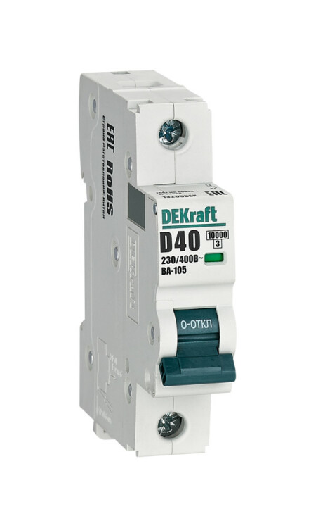Автоматический выключатель серии ВА-105 DEKraft; 1P; ном. ток 40 А; характеристика D; откл. способность 10 кА; ширина модуля 18 мм. Аппараты имеют механизм мгновенной коммутации, 6 монолитных заклепок, которые повышают прочность корпуса. Боковые каналы охлаждения повышают стабильность работы при высоких температурах окружающей среды. Есть возможность установки дополнительных аксессуаров с левой стороны устройства. Аппарат на 100% совместим с корпусами и оболочками DEKraft и Systeme Electric.