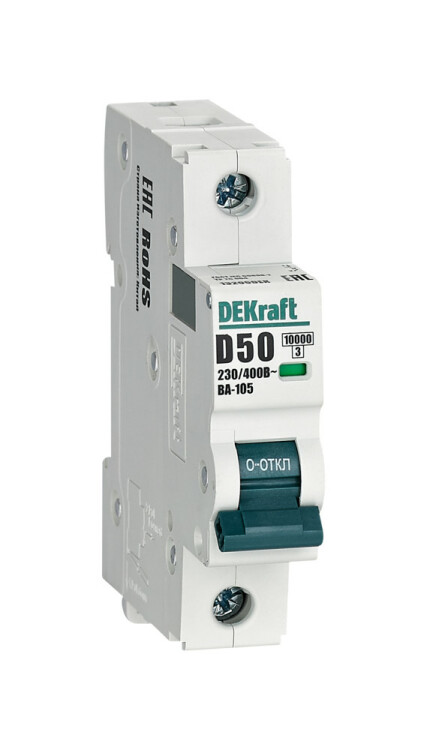 Автоматический выключатель серии ВА-105 DEKraft; 1P; ном. ток 50 А; характеристика D; откл. способность 10 кА; ширина модуля 18 мм. Аппараты имеют механизм мгновенной коммутации, 6 монолитных заклепок, которые повышают прочность корпуса. Боковые каналы охлаждения повышают стабильность работы при высоких температурах окружающей среды. Есть возможность установки дополнительных аксессуаров с левой стороны устройства. Аппарат на 100% совместим с корпусами и оболочками DEKraft и Systeme Electric.