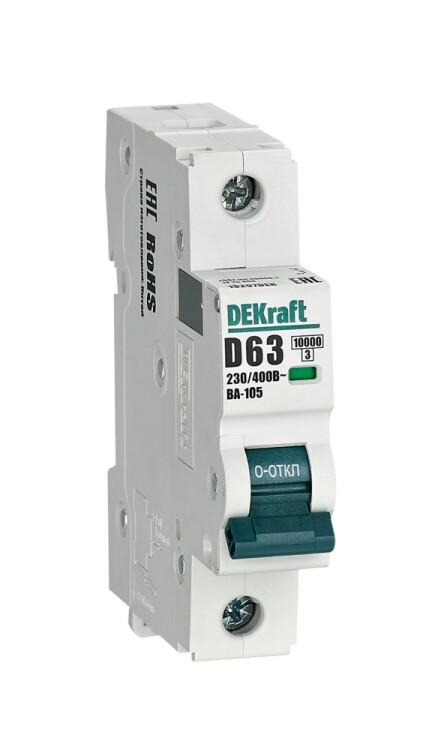 Автоматический выключатель серии ВА-105 DEKraft; 1P; ном. ток 63 А; характеристика D; откл. способность 10 кА; ширина модуля 18 мм. Аппараты имеют механизм мгновенной коммутации, 6 монолитных заклепок, которые повышают прочность корпуса. Боковые каналы охлаждения повышают стабильность работы при высоких температурах окружающей среды. Есть возможность установки дополнительных аксессуаров с левой стороны устройства. Аппарат на 100% совместим с корпусами и оболочками DEKraft и Systeme Electric.
