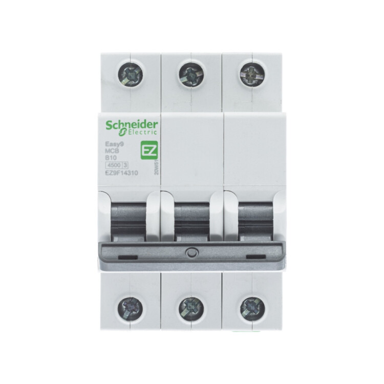 Автоматический выключатель серии Easy9 Schneider Electric, 3-полюсный, номинальный ток 10 А, характеристика В, Icn = 4.5 кА.