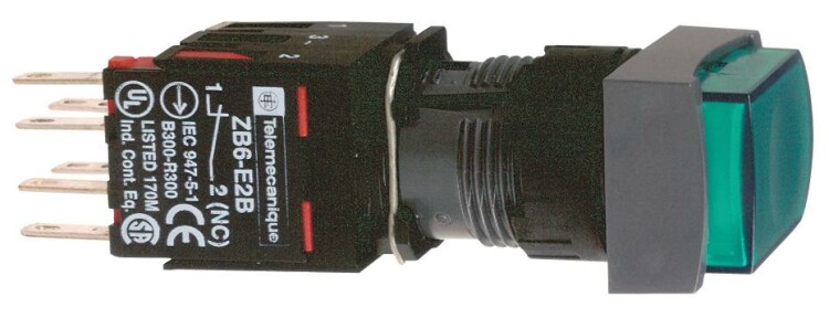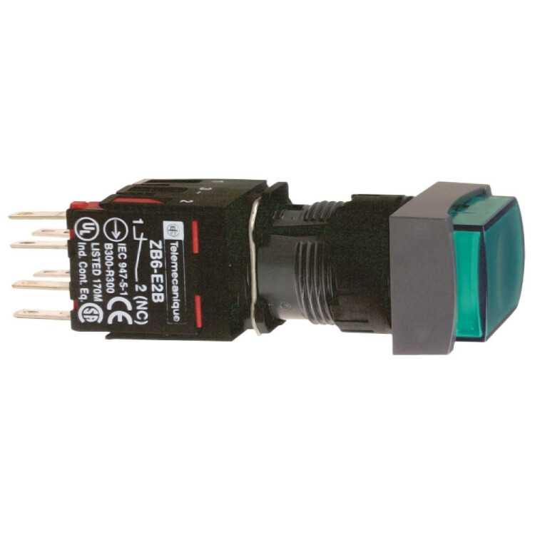 Кнопка 16мм 12-24В зеленая с подсветкой квадратная. серия продукта: Harmony XB6 - тип устройства или его аксессуаров: кнопка в сборе с подсветкой - краткое название устройства: XB6 - монтажный диаметр: 16 мм - тип контактов: 1 Н.О. + 1 Н.З. - работа контактов: медленное размыкание - источник света: Светодиодная лампа - цоколь лампы: встроенный светодиод. Преимущества: Элементы конструкции визуально различимы с большого расстояния благодаря яркому цвету и маркировке, поэтому ошибки при первоначальном подключении и последующих операциях обслуживания сводятся к минимуму. Корпус со степенью защиты IP66 защищает данное устройство от ударных нагрузок, а также от пыли, воды и вибрации, поэтому оно идеально подходит для работы в неблагоприятных условиях окружающей среды.Применения: в средах, где необходима хорошая устойчивость к химическим веществам и/или двойная электрическая изоляция.