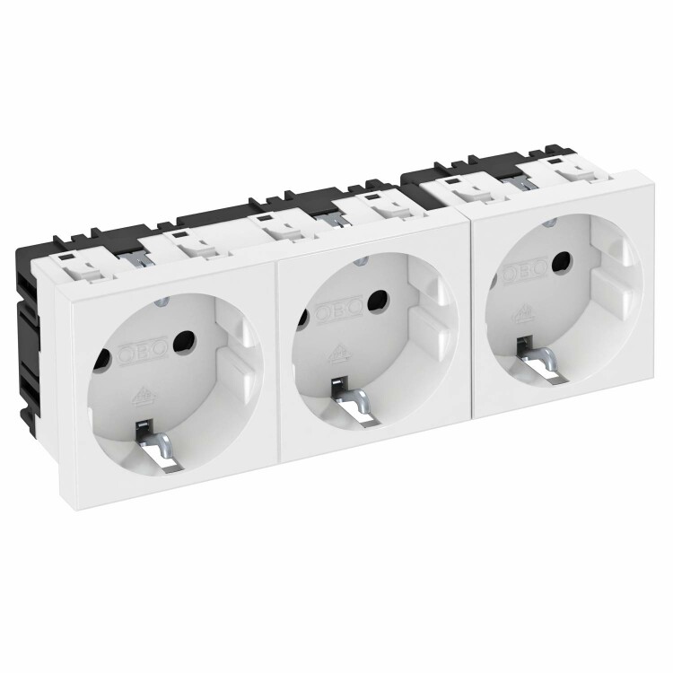 Розетка с заземляющим контактом,тройная 0, с защитными шторками, с автоматическими клеммами, 2-полюсная, 16 A, 250 V, автоматические клеммы соответствуют стандарту ГОСТ Р51322.1-2001 МЭК 60884-1:2006.