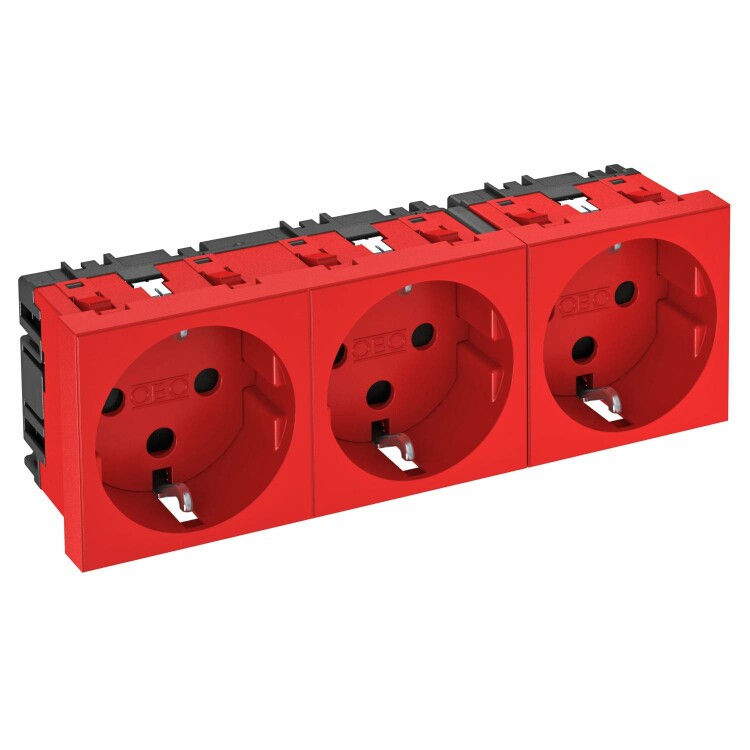 Розетка с заземляющим контактом 2К+З, тройная, с кодом, с защитными шторками, с 2-полюсными автоматическими клеммами, 16 A, 250 V, автоматические клеммы соответствуют стандарту ГОСТ Р51322.1-2001 МЭК 60884-1:2006. Данная розетка может использоваться только в сочетании с кодировочным ключом типа CST-STD.