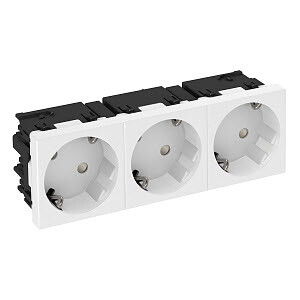 Розетка с заземляющим контактом, тройная 33°, с защитными шторками, с автоматическими клеммами, 2-полюсная,16A250V~, автоматические клеммы соответсвуют стандарту ГОСТ Р51322.1-2001 МЭК 60884-1:2006.