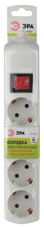 Колодка электрическая Эра K-4es с заземлением, с выключателем, 4 розетки. Корпус выполнен из ударопрочного и негорючего пластика. Рассчитана на максимальную мощность 16А / 3500 Вт и для подключения кабеля сечением до 1,5мм2. Электрическая колодка подойдет для тех, кто хочет сделать удлинитель самостоятельно. Также может использоваться как накладные розеточные блоке в подсобных помещени ях.