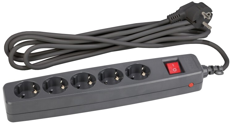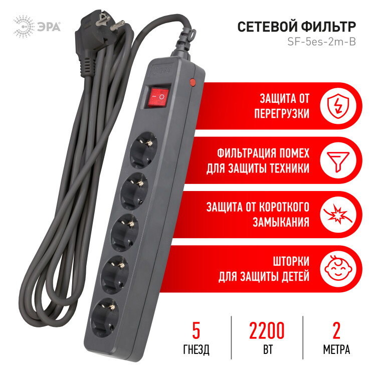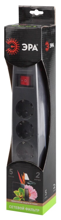 SF-5es-2m-B Сет.фильтр ЭРА (черный) с заземл, 3x0.75мм2, со шт, с выкл, 5гн, 2м, кор (20/360) (кр.20шт) | C0039529