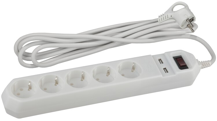 Сетевой фильтр удлинитель Эра USF-5es-1.5m-USB-W с заземлением, с выключателем, 2USB, ПВС, 3x0,75мм2, 5 розеток, 1,5 м. Базовый уровень защиты техники: от имупльсных помех, от перегрузки, от короткого замыкания. Максимальная мощность 10А/2200 Вт. Корпус из ударопрочного и не горючего пластика (поликарбонат). Вилка обеспечена кольцом для удобного извлечения ее из розетки. Присутствует отверстие для крепления сетевого фильтра на разные поверхности. Отлично подойдет для защиты бытовой и компьютерной техники. Например: компьютеров, стиральных машин и кухонных бытовых приборов. Сетевой фильтр оснащен 2USB для зарядки мобильных устройств. Дизайн сетевого фильтра разработан в России командой Эра Slyle.