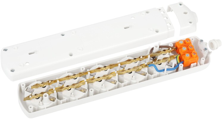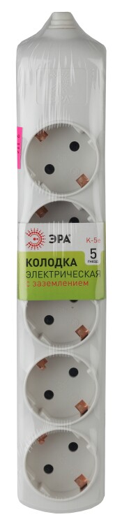 Колодка электрическая Эра K-5e с заземлением, 5 розеток. Корпус выполнен из ударопрочного и негорючего пластика. Рассчитана на максимальную мощность 16А / 3500 Вт и для подключения кабеля сечением до 1,5мм2. Электрическая колодка подойдет для тех, кто хочет сделать удлинитель самостоятельно. Также может использоваться как накладные розеточные блоке в подсобных помещениях.