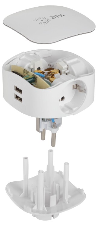 Тройник (адаптер) ЭРА с 3-мя розетками и 2-мя USB гнездами для зарядки портативных устройств. Идеален для зарядки мобильных телефонов и планшетов. Незаменим с собой в дороге. Особенно актуален когда в помещении мало источников подключения - можно из одной розетки сделать три и при этом ещё заряжать 2 устройства одновременно через USB. Максимальная мощность USB разъемов: 2100 мА. Разработан в России.