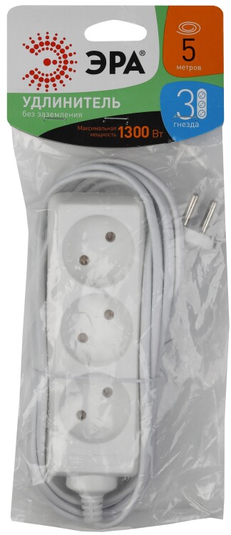 Удлиниль бытовой ЭРА. Серия UX Для подключения маломощных устройств до 1300Вт. Максимальная мощность 6 А/ 1300 Вт. Без заземления. Провод ШВВП.