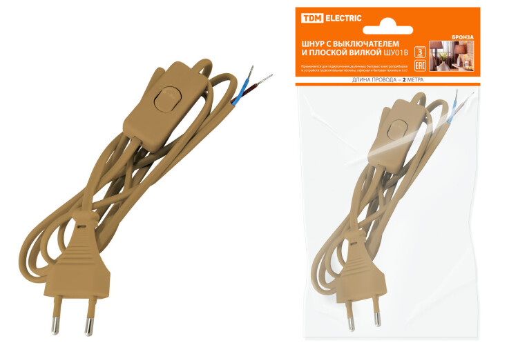 Шнур с выключателем и плоской вилкой ШУ01В ШВВП 2х0,75мм2 2м. бронза TDM (кр.1шт)