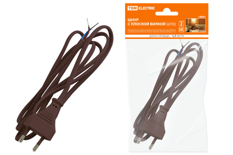 Шнур с плоской вилкой ШУ02 ШВВП 2х0,75мм2 1,7 м. коричневый "ЭКО" TDM (кр.1шт)