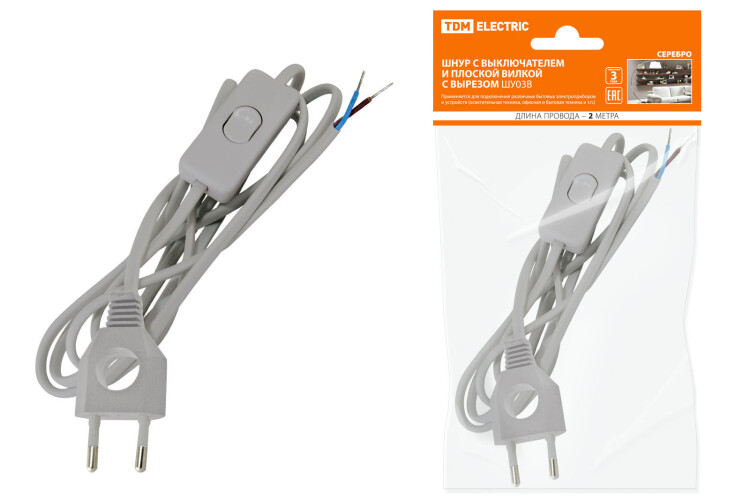 Шнур с выключателем и плоской вилкой с вырезом ШУ03В ШВВП 2х0,75мм2 2 м. серебр. металлик TDM (кр.1шт)