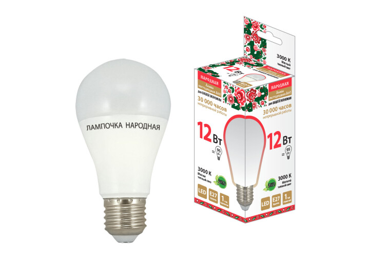 Лампа светодиодная НЛ-LED-A60-12 Вт-230 В-3000 К-Е27, (60х112 мм), Народная (кр.10шт) нМ