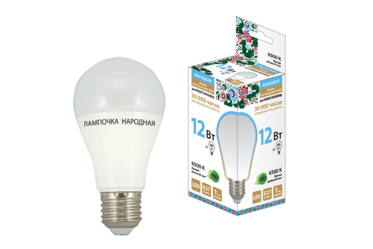Лампа светодиодная НЛ-LED-A60-12 Вт-230 В-6500 К-Е27, (60х112 мм), Народная (кр.10шт) нМ