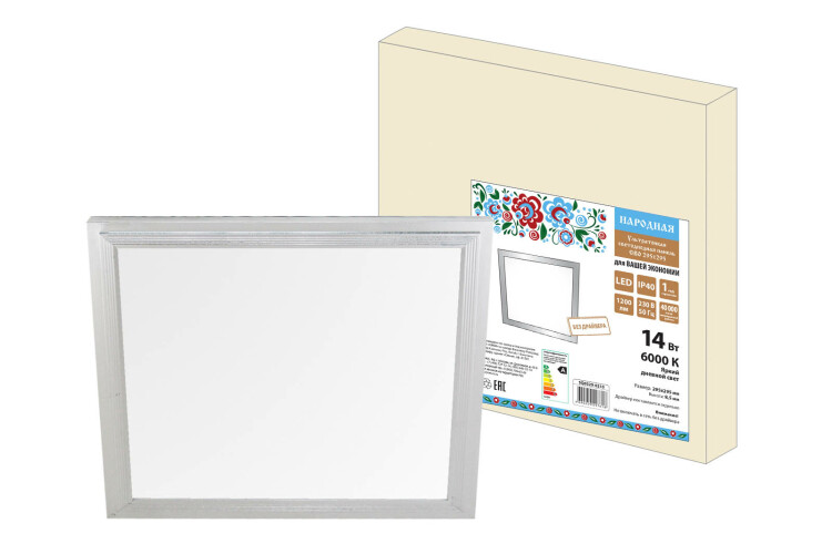 Ультратонкая светодиодная панель серии СВО 295х295, 14 Вт, 6000 К, хром, Народная (без драйвера) (кр.1шт)