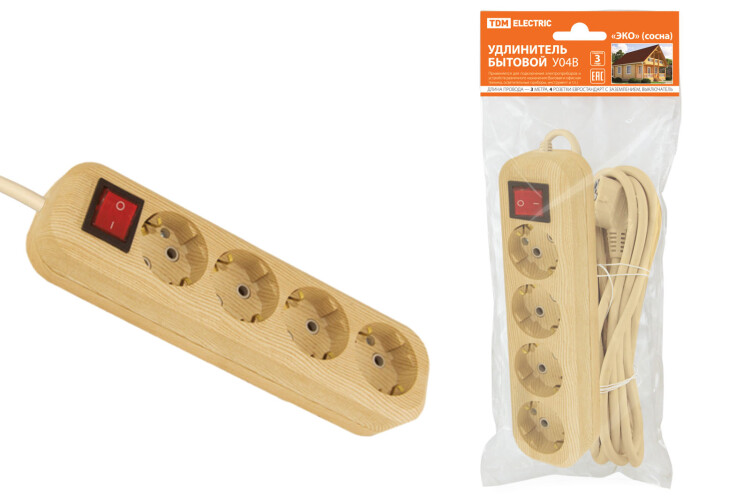 Удлинитель бытовой У04В выключатель, 4 гнезда, 3метра,2П+3, ПВС 3х1мм2 "Эко" (сосна) 16А/250В TDM (кр.1шт)