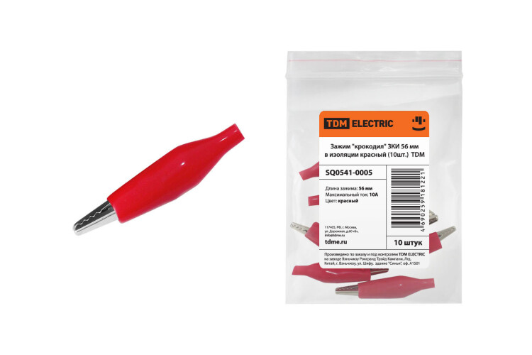Зажим "крокодил" ЗКИ 10А 56мм в изоляции красный (10шт) TDM (кр.10упак)