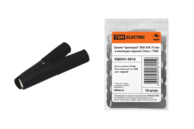 Зажим "крокодил" ЗКИ 30А 75мм в изоляции черный (10шт) TDM (кр.10упак)