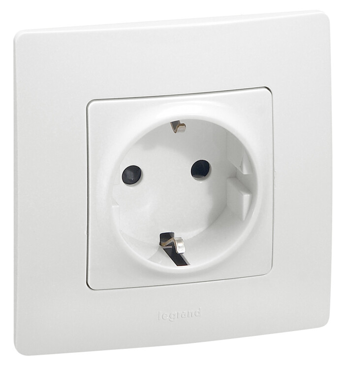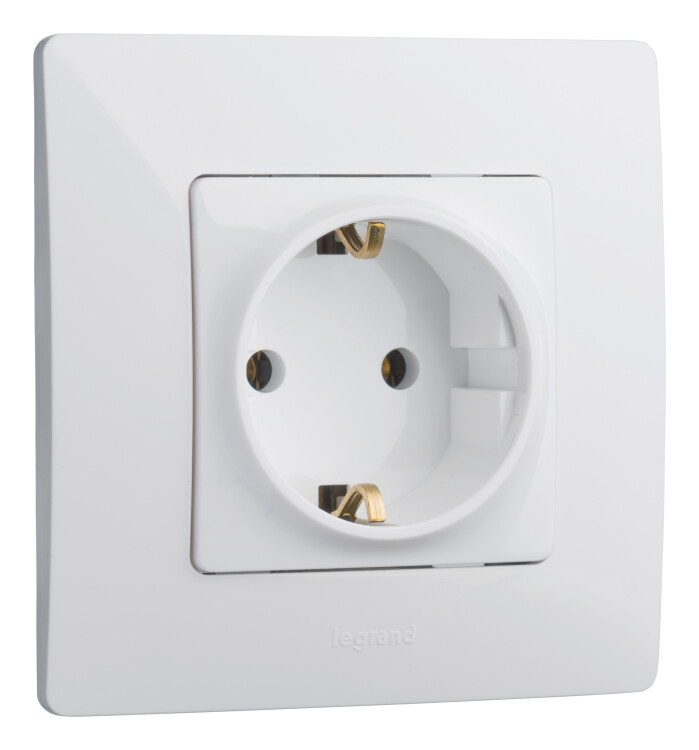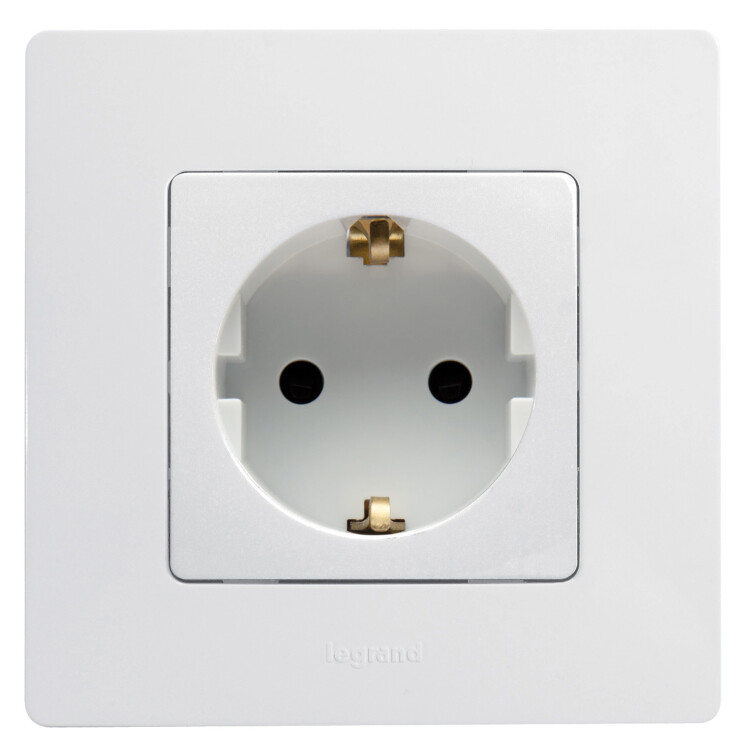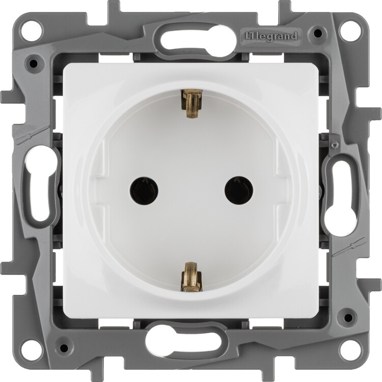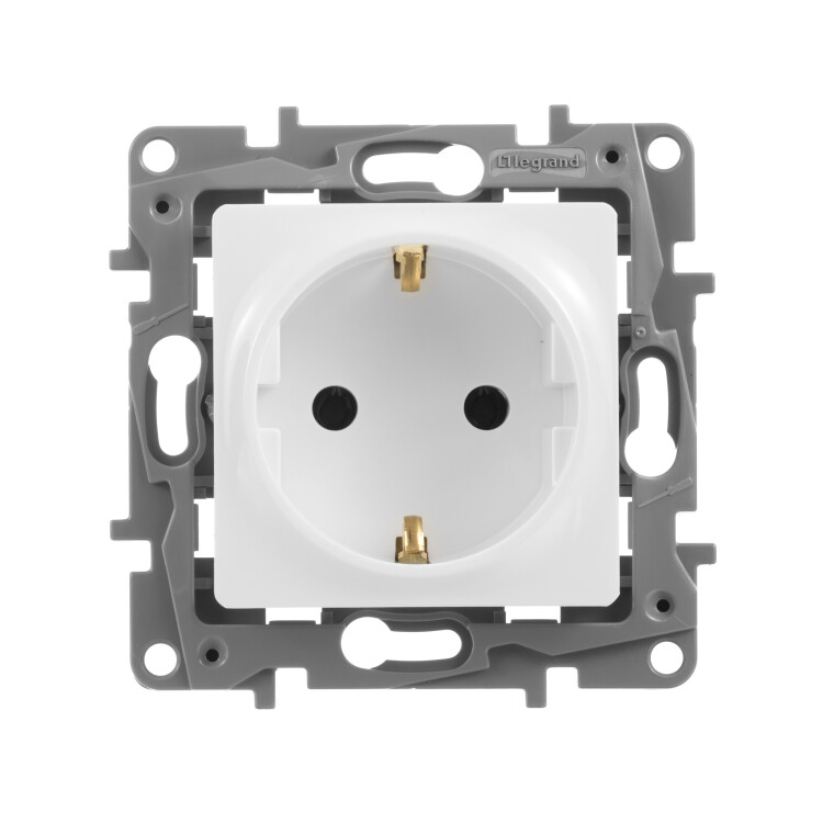 Розетка с заземлением Legrand Etika для скрытого монтажа, цвет белый. Максимальный ток 16 А, максимальная мощность 3680 Вт. Применяется в зданиях, оборудованных для повышения безопасности проводкой с заземлением (с защитным проводником).
