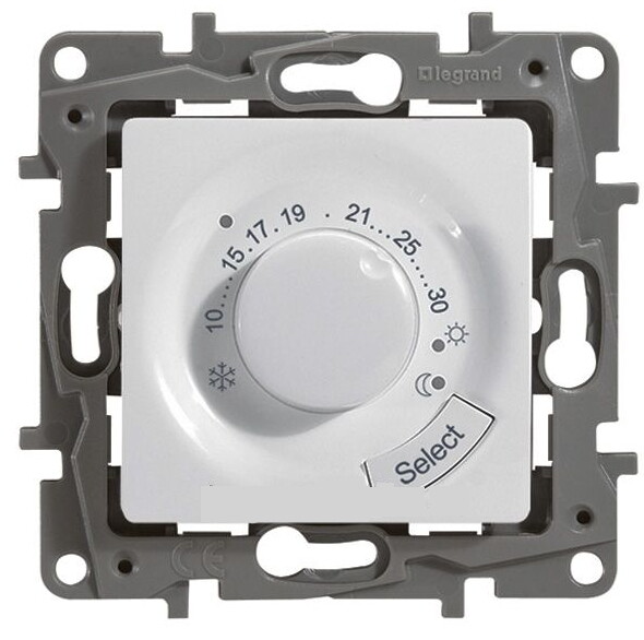 Терморегулятор серии Etika для управления электрическим теплым полом по показаниям внешнего датчика температуры. Применяется в жилых помещениях, санузлах и коммерческих интерьерах для поддержания комфортного режима нагрева и ограничения перегрева покрытия. Устанавливается в стандартное монтажное место и сочетается с механизмами серии.