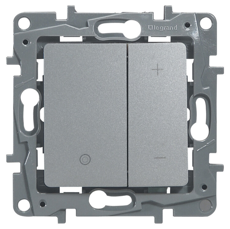 Клавишный светорегуляторEtika для скрытого монтажа, цвет алюминий. Позволяет регулировать яркость ламп. Экономит электроэнергию. Благодаря функции плавного включения существенно продлевает срок службы ламп. Встроенная память позволяет одним нажатием выводить яркость на комфортный уровень. Предусмотрен режим с фиксированными уровнями яркости (33-66-100%). Электронная защита от перегрузки и короткого замыкания.