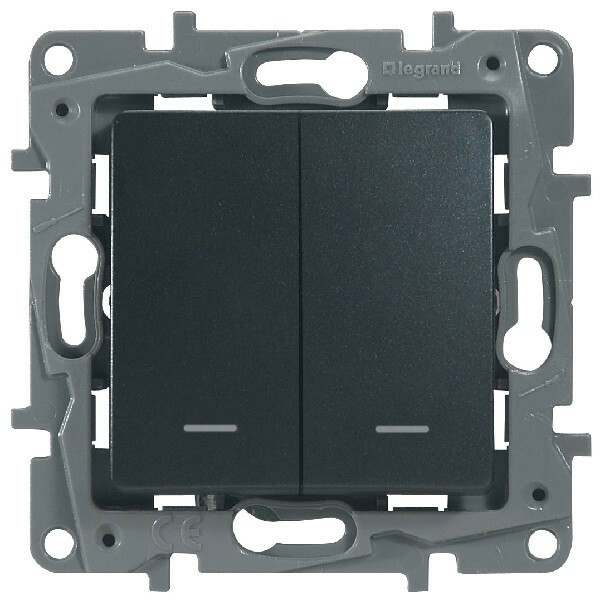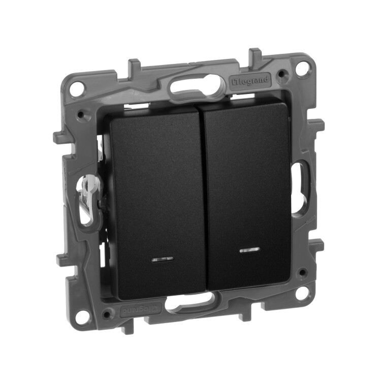 Переключатель с подсветкой двухклавишный Legrand Etika для скрытого монтажа, номинальный ток 10 А, цвет антрацит. Предназначен для управления двумя нагрузками с одного или с двух мест.