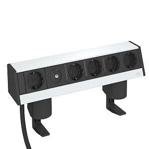 Настольный бокс с соединительным кабелем, кабельный вывод с нижней стороны, с 2 крепежными зажимами для фиксации на столешнице толщиной от 8 до 40 мм. Комплектация: - с 5 розетками 0° с защитным контактом, черного цвета, из них 1 розетка для тока длительной нагрузки и четыре розетки переключаются с помощью выключателя (с синей подсветкой), с сетевым кабелем 3,0 м с угловым штекером CEE 7/7.