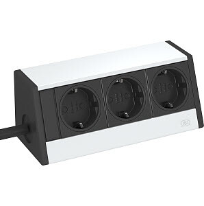 Настольный бокс с силовым кабелем, кабельный вывод расположен с левой стороны, свободно фиксируется на столе благодаря противоскользящей поверхности нижней стороны. Комплектация: - три черные розетки с защитным контактом с углом установки 0°, вкл.3,0 м сетевого кабеля с угловой штепсельной вилкой CEE 7/7.