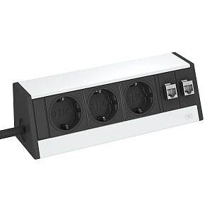 Готовый к подключению настольный бокс с соединительным кабелем, вывод для кабеля с левой и правой стороны, фиксируется на столе с помощью противоскользящих опорных точек. Комплектация: - три черные розетки 0° с защитным контактом, 3 м кабеля с угловой штепсельной вилкой CEE 7/7, кабельный вывод с левой стороны; - два телекоммуникационных модуля RJ45 на RJ45, соединение 1:1, кат 6 экранированные, кабельный вывод с правой стороны.